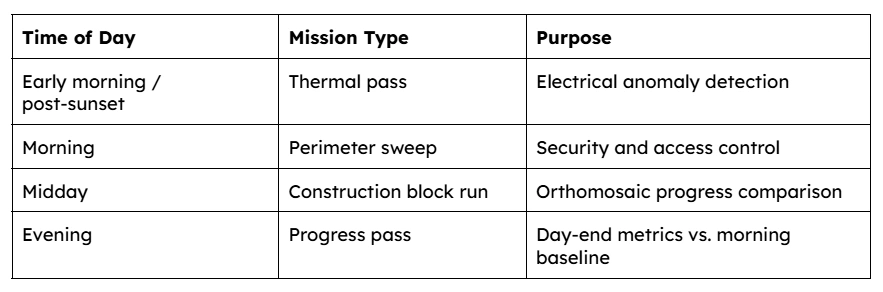A typical autonomous deployment runs multiple mission types on staggered schedules across a single day: